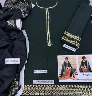 • Shirt Fabric: Dhanak• Pattern: Embroidered• Shirt Front Pattern: Embroidered• Neckline: Embroidered• Sleeves Pattern: Patch Work• Trouser Fabric: Dhanak• Trouser Pattern: Plain• Dupatta Fabric: Pashmina• Dupatta Pattern: Digital Print• Number Of Pieces: 3 Pcs• Package Includes: 1 x Shirt, 1 x Trouser, 1 x Dupatta• Shirt Cutting: 3 Meter• Trouser Cutting: 2.25 Meter• Dupatta Cutting: 2.5 Meter• Color: Green• Note: There might be an error of 1-3 cm due to manual measurement, and slight color differences may occur as a result of varying lighting and monitor effects.